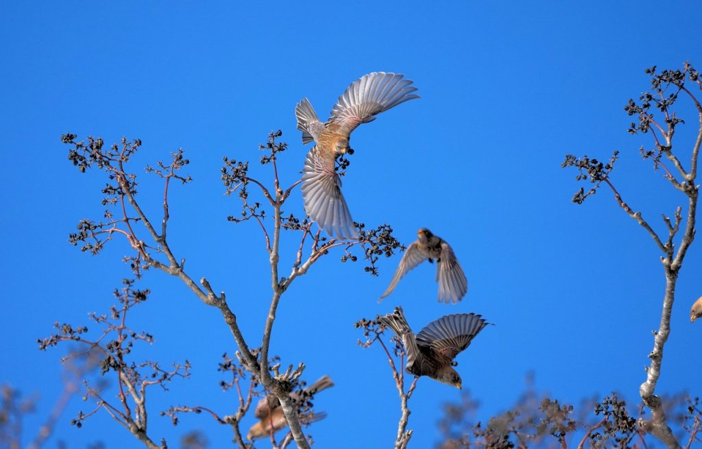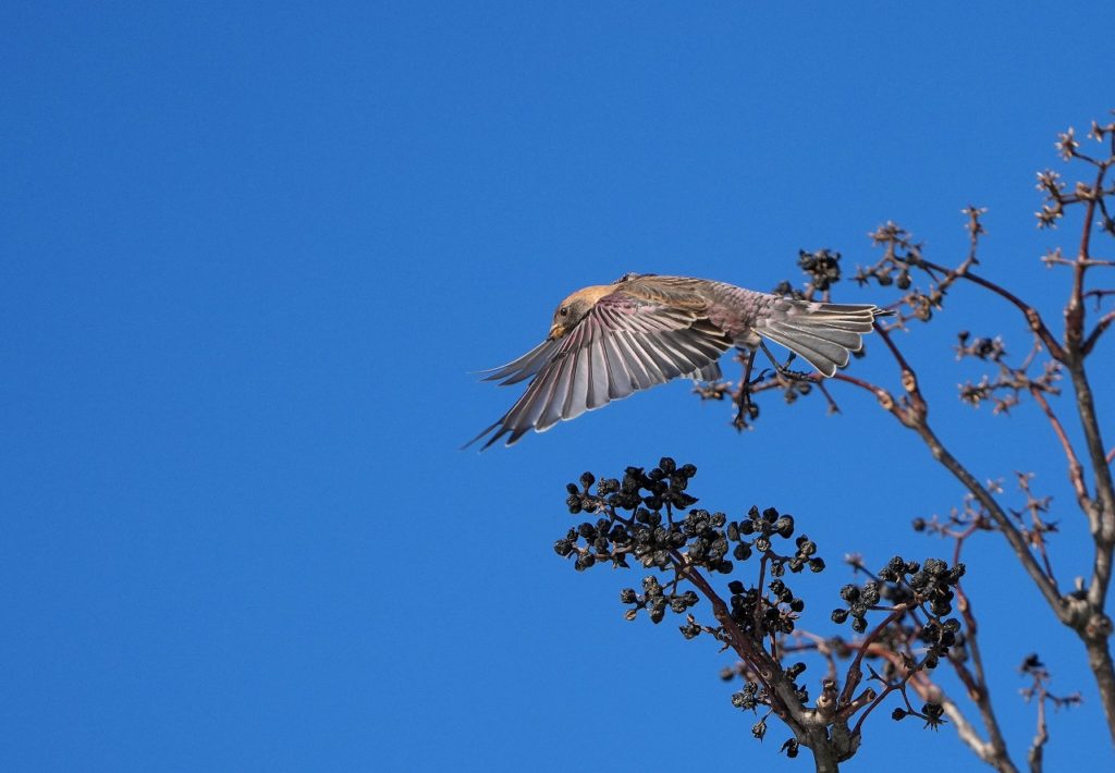 ハギマシコの飛翔の写真、とてもきれいですねー